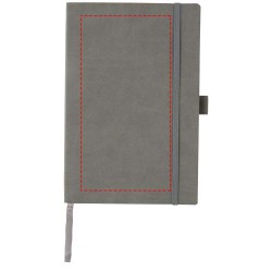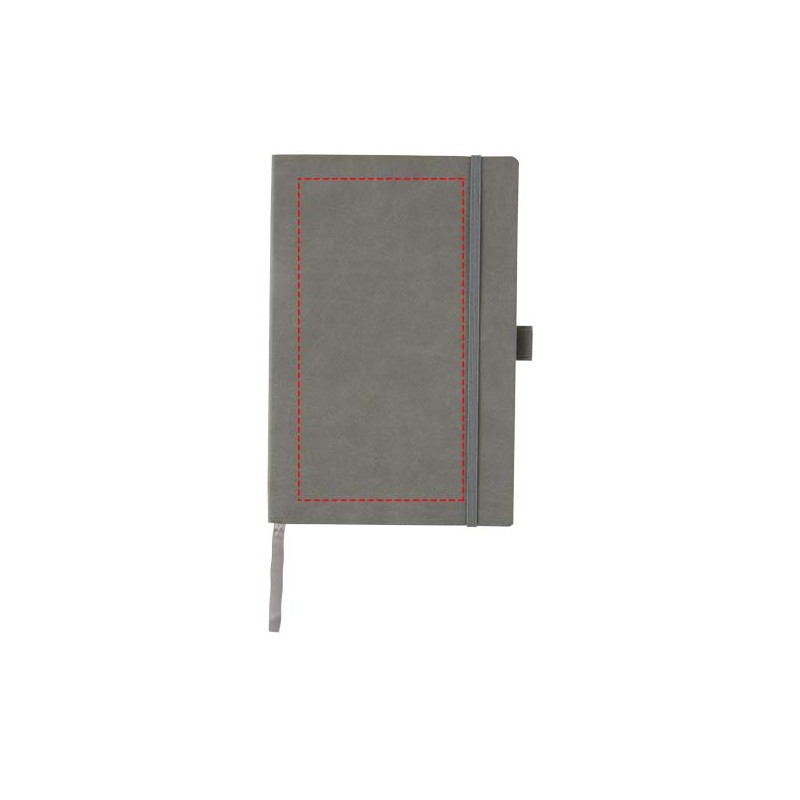Cahier avec couverture souple douce au toucher (référence de taille A5) avec fermeture élastique intégrée, ruban marque-pages, boucle à stylo, pochette pour document à l'intérieur de la couverture arrière et 80 feuilles (80 g/m2) de papier ligné crème. Emballé dans une pochette noire.