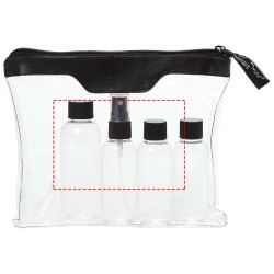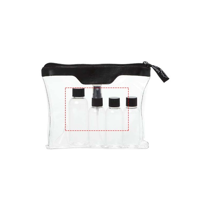 Cette trousse très fonctionnelle est acceptée à bord des avions. Elle contient 2 flacons de 50ml, 1 de 90 ml, un vaporisateur et un entonnoir. Les différents éléments sont livrés séparément de la trousse. Marquage indisponible sur les composants.